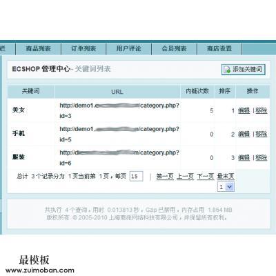 • 在ECSHOP现有后台进行管理,更方便,更灵活 论坛里有人发布过使用文本文件进行管理的,个人认为使用后台管理的会更方便些 • 在EC后台对“关键词”以及“站内链接”进行增删改, • 可以设置每个内链在每个页面中的重复次数。 比如"内链出现次数"设置为1,那么就只在第一次出现的关键字上加链接