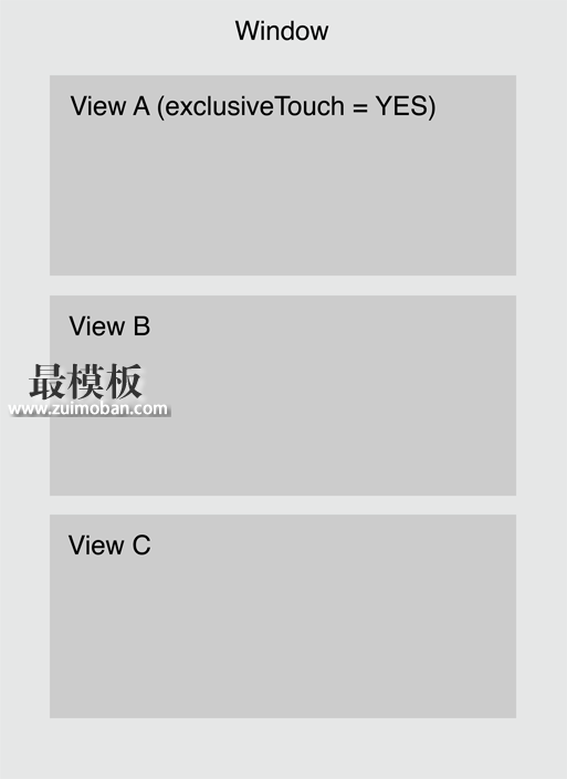 If the user touches inside A, it recognizes the touch. But if a user holds one finger inside view B and also touches inside view A, then view A does not receive the touch because it was not the only view tracking touches. Similarly, if a user holds one finger inside view A and also touches inside view B, then view B does not receive the touch because view A is the only view tracking touches. At any time, the user can still touch both B and C, and those views can track their touches simultaneously. exclusiveTouch 这个属性比较傲娇,只有当设置它的为 YES 的 view 首先收到触摸事件时,它才能响应。 限制事件分发到 subviews 上 (hitTest:withEvent:)Restrict event delivery to subviews. 重载 hitTest:withEvent: 方法返回自己 self。 关闭事件的分发