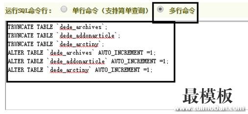 第一步:进入自己的DEDECMS网站后台,点击后台菜单---------系统--------SQL命令行工具。这里可以供站长进行SQL操作; 第二步:复制以下sql语句到sql命令行工具的输入框内,并选择“多行命令”后点击确定即可(以下sql语句中,dede_为数据表前缀,改为自己网站相应的数据表前缀即可);
