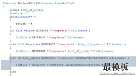 //分析远程文件路径 $remotefile = str_replace(DEDEROOT, '', $TRUEfilename); $localfile = '..'.$remotefile; //创建远程文件夹 $remotedir = preg_replace("#[^\/]*\.html#", '', $remotefile); $this->ftp->rmkdir($remotedir); $this->ftp->upload($localfile, $remotefile, 'ascii'); } } } $this->TempSource==''; } } ![]() wap模板中调用头部和底部文件需要修改 找到include目录文件dedetag.class.php中大概1013行的函数 function IncludeFile 在 else{ return "无法在这个位置找到: $filename"; } 前加 else if(file_exists(DEDEROOT.'/templets'.DEDEWAPTEMPLATESPATH.$filename) ) { $okfile = DEDEROOT.'/templets'.DEDEWAPTEMPLATESPATH.$filename; }