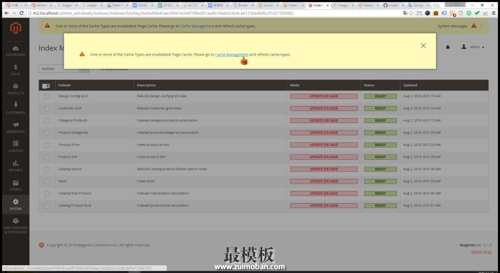 在安装完Magento2之后,第一次进入后台,Magento马上送给我们一个惊喜。 “One or more indexers are invalid. Make sure your Magento cron job is running."