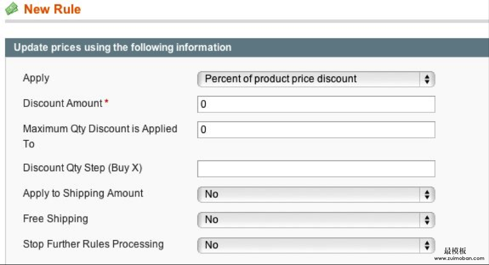 其余选项是自我解释通过他们的标签。他们决定是否折扣可以应用于航运价格、 允许自由航运方法出现在购物车上,给继续处理规则或停止后这一应用的能力。