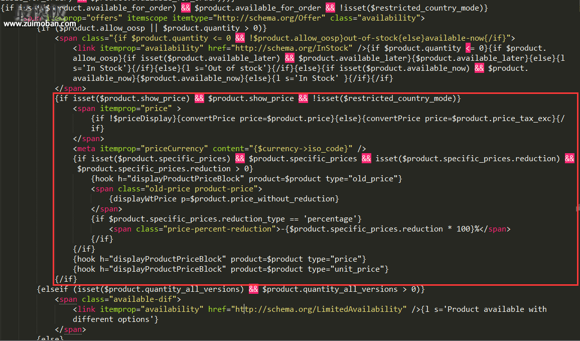 使用 ftp 工具,进入到 Themes,进入目前使用的主题,找到 product-list.tpl 文件。使用 sublime 等编辑工具,搜索 href="http://schema.org/InStock" 字段,大致如下: