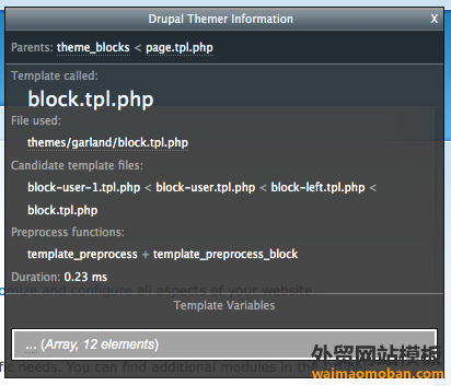 前往网站前台并查看底部左手角落,你可看到一个叫"Themer Info"的黑色方块,选中他。
