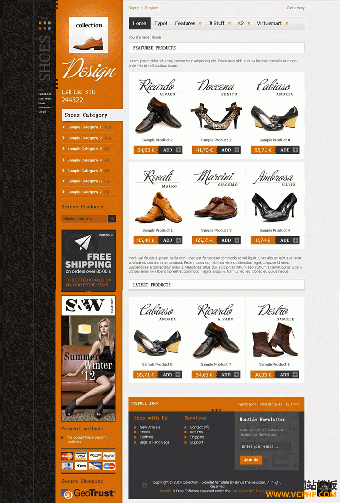 收集设计和用于e-shops已经彻底和特别是对鞋子的销售,但不是唯一。温暖的、褐色色调的棕色使它成为一个真正惊人的模板。K2和Virtuemart包括,为您提供各种技术来展示你的博客或e-shop。因此收集可以满足即使是最苛刻的web开发人员。
