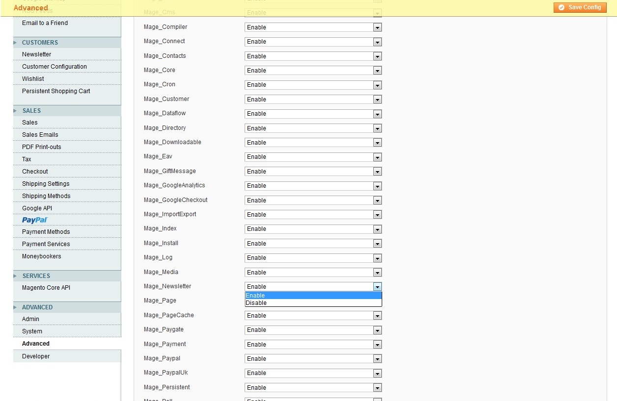 首先,请确保在您的网站启用了您的新闻稿。从 Magento 的仪表板,您需要导航到的系统-> 配置-> (高级) 高级-> 禁用模块输出部分,并设置为"启用"Mage_Newsletter。