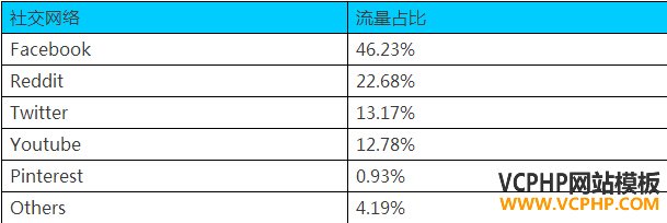 5.社交流量 2015年1月的数据显示,社交渠道流量占总流量比重的3.33%,即26.3万/天。在过去的一年中,各社交渠道来源占比如下表。