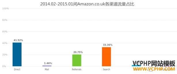 由图可知,直接访问流量占比41.52%,搜索流量占比33.36%,引荐流量占比20.75%,其他流量占比4.37%。 4.搜索流量 2015年1月亚马逊英国站(amazon.co.uk)的搜索渠道流量占比32.37%, 搜索渠道平均每天为网站贡献了255.7万的流量。在过去的一年中,搜索流量渠道来源占比如下表。