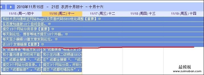 下面咱们先看看吴锋个人平时的网络推广计划制定例子吧。如果你有Google账号,只要开通Google日历功能,就能利用Google日历编写自己的网络推广计划。看下面图吧,网络推广计划是不是一目了然,红色笔画分隔线之上是一周的整体网络推广计划,红色笔画隔线之下是每天的网络推广计划,包括周一、周二网络推广计划,因为吴锋写该篇文章时候正好是周二,周三之后的每天计划还没写呢。好了,咱们下面开始实战,Google日历制定网络推广计划操作细节,认真点阿。