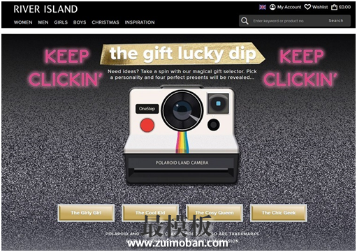 3、礼物指南为了缩小礼物搜索范围,礼物指南这类内容可以在圣诞里有效的吸引消费者。比如River Island的“Lucky Dip”,它是一个基本的工具,能根据消费者选择的种类,随机显示四个礼物点子。