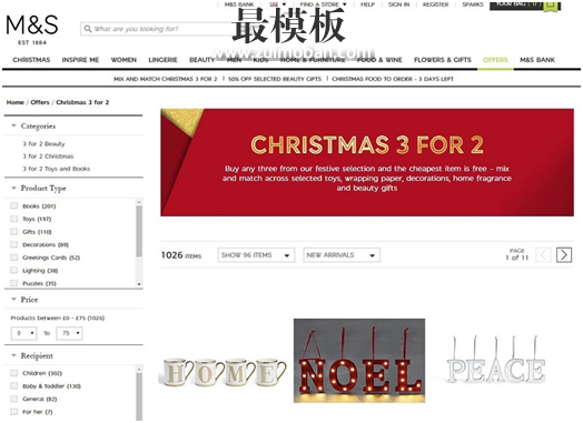 在很多零售商都把过滤器作为礼物指南的情况下,“Lucky Dip”的创意做法让人眼前一亮。 4、提供组合产品圣诞是卖家促销组合产品的绝佳时机。很多消费者的目标不止是购买一种商品,所以给他们提供组合产品,会让消费者难以抵挡住诱惑。 Thorntons就采用了这个策略,在首页顶部推广了“3 for 2”的组合产品,Marks & Spencer也用了这个技巧。