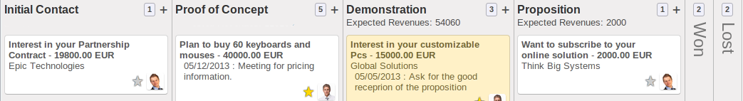 轻松地管理你的销售漏斗。抓住客户线索,通过电话以及会谈的形式进行后续跟进。 通过分析客户线索的质量帮助您做出正确的决定,将邮件直接集成到模块中也可以让你节省时间。